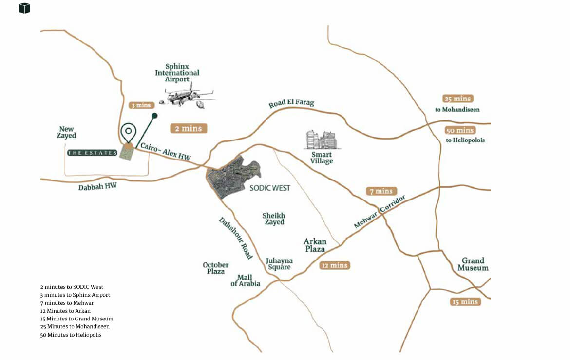 The compound is found minutes away from SODIC West, Sphinx Airport, Mehwar, Arkan, Grand Museum, Mohandiseen, and Heliopolis. It will also have access to the New Zayed Ring Road that will connect this whole new area together.